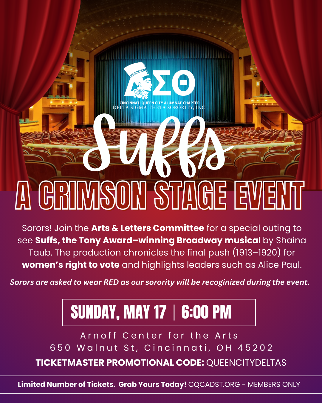 Meet the Arts & Letters Committee at the Arnoff Center for the Arts, on Sunday, May 17, beginning at 6:00 PM for a special outing to see Suffs, the Tony Award-winning Broadway musical! This remarkable event chronicles the final push (1913-1920) for women’s right to vote.